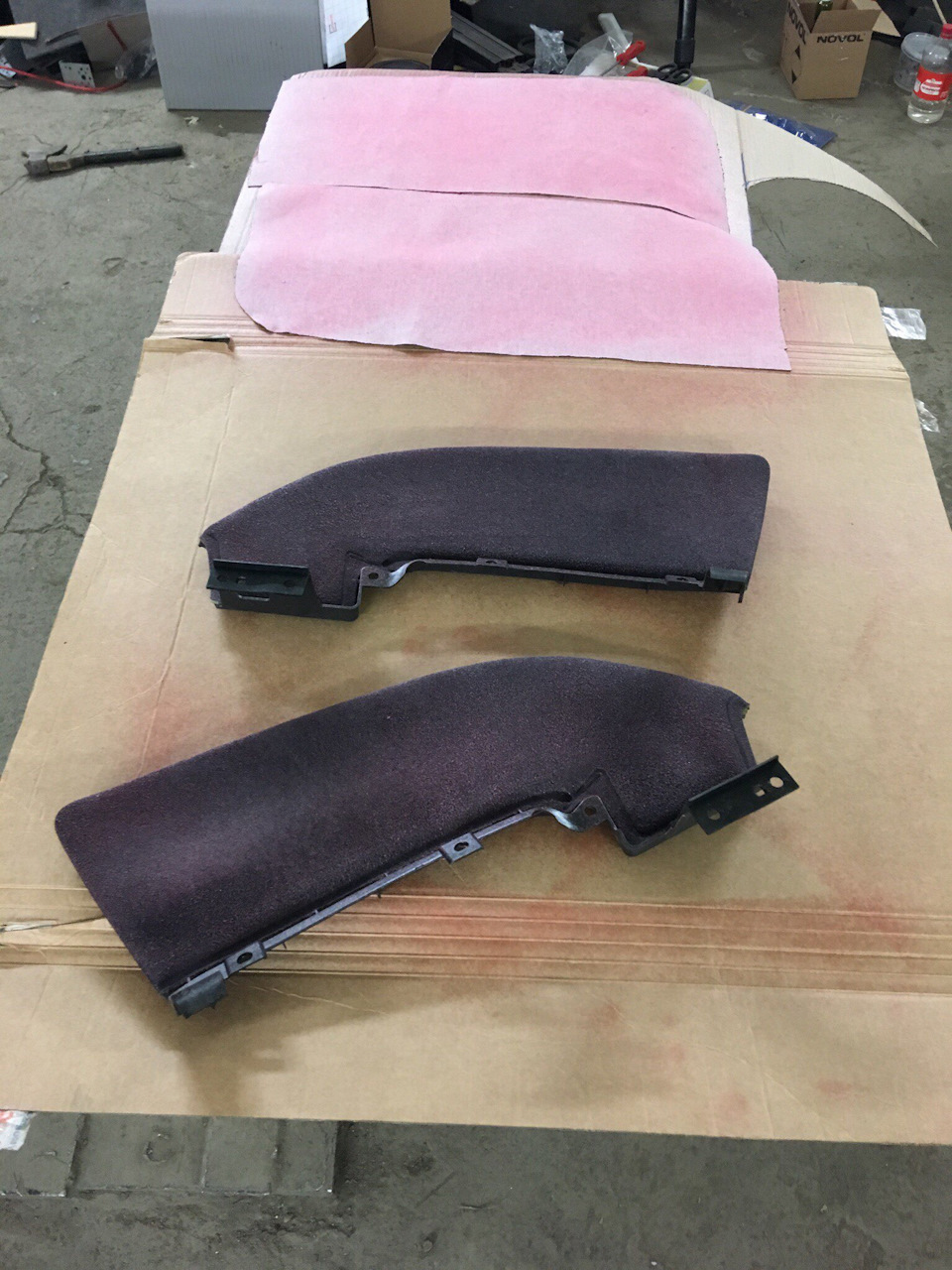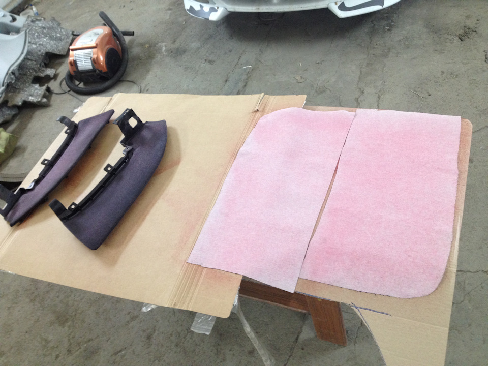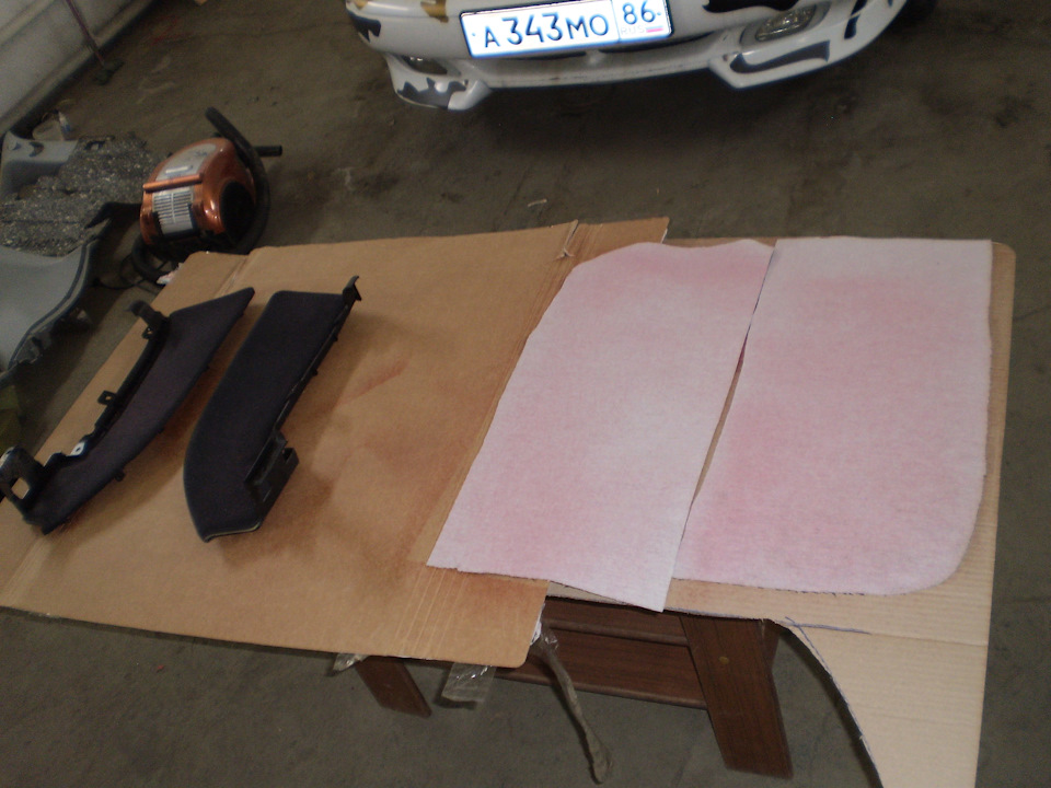 Zveřejňujeme také fotografie čalounění vložek obložení dveří. Přetahují se přes standardní látku s rubem. Bylo použito stejné lepidlo “888 Red” jako na strop. Jediný rozdíl je v tom, že materiál byl složen a nalepen na plast, což znamená, že plast je potřeba nejprve obrousit a odmastit pro lepší přilnavost lepidla =)
