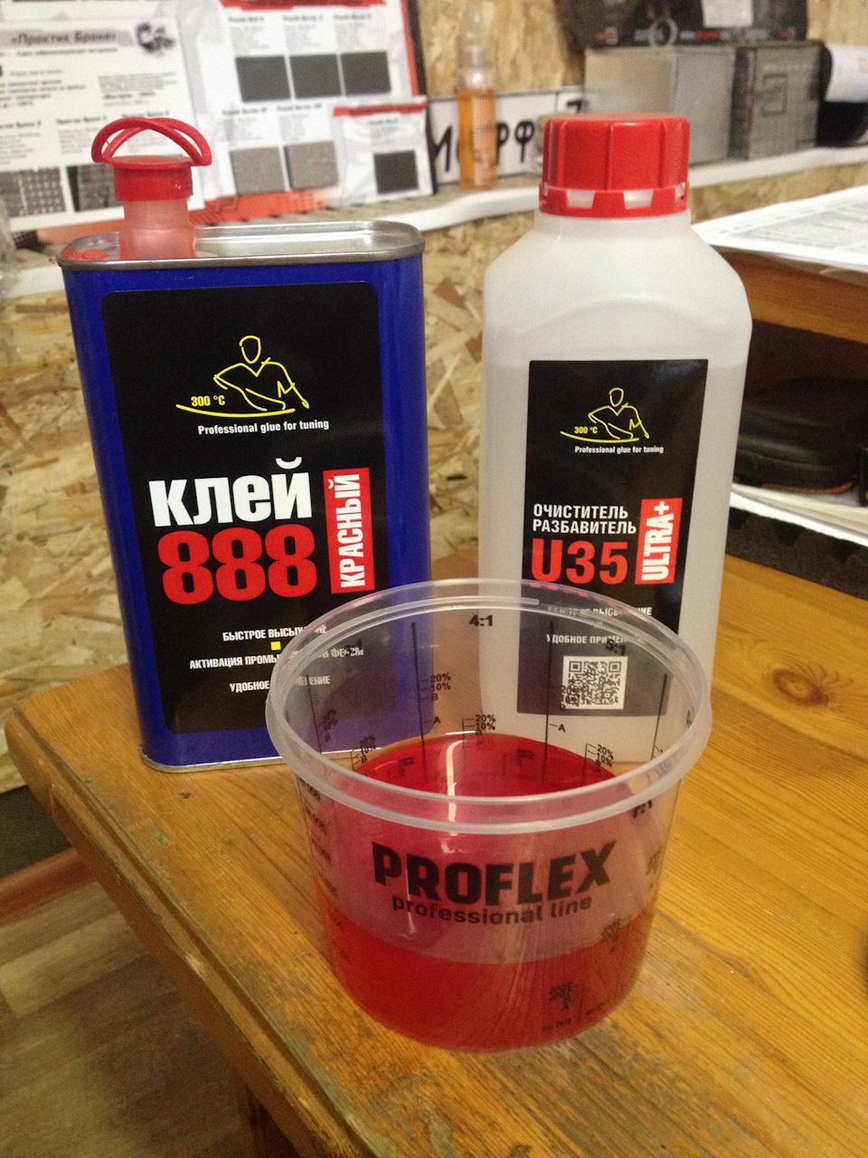 — Smíchejte lepidlo „888 Red“ s ředidlem U35 v poměru 1:1 (pro aplikaci štětcem smíchejte 3:1)