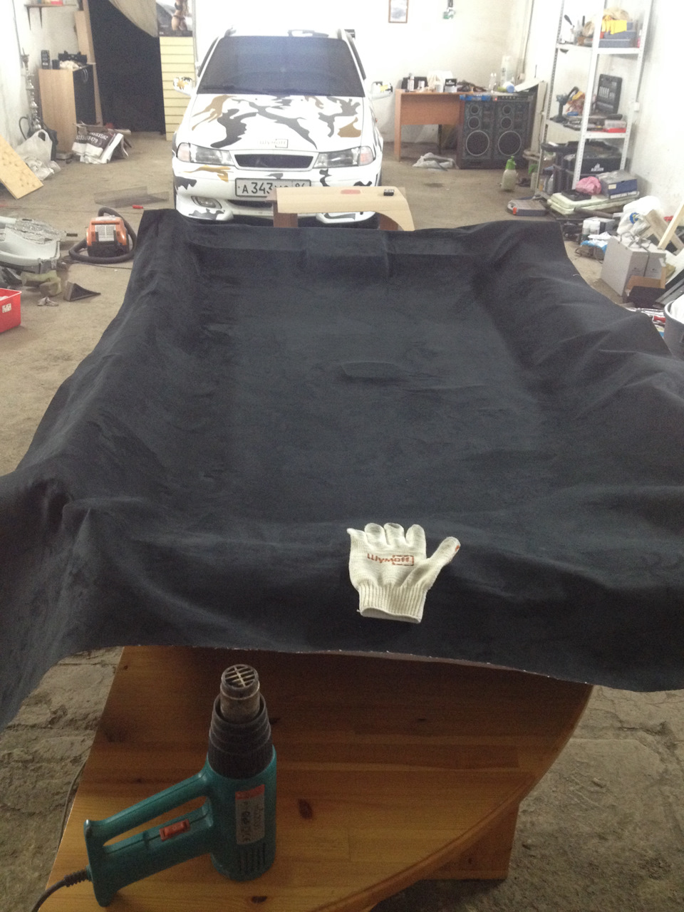 4) POVINNÉ! nasaďte si rukavice! A zapneme průmyslový vysoušeč vlasů na 300-350 stupňů. Na provoz při takové teplotě je nutné materiál předem vyzkoušet! Před nanesením lepidla, jinak vám toto lepidlo prostě nebude fungovat!