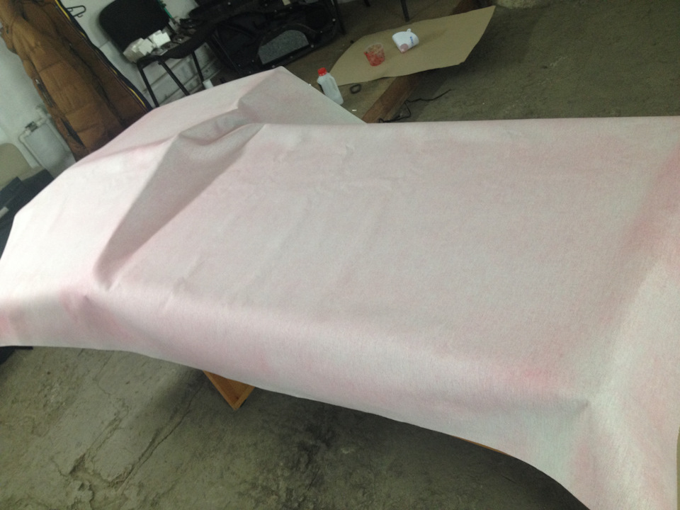6) Nyní, když je celá „přední“ část podšívky zafixována lepidlem, otočte podšívku (materiály dolů) a začněte zasouvat přebytečnou látku a přilepte ji zevnitř. Není vyžadován velký záhyb, hlavní věc je, že materiál je dobře přilepen. Skončili jsme se záhybem asi 2-4 cm Kvůli nerovným okrajům stropního obložení nebude možné lepit materiál v souvislém „pásu“. Umístění ukazuje, kde je třeba materiál oříznout, aby ležel rovně a dobře přilnul k povrchu. Lepíme úplně stejným způsobem pomocí průmyslového fénu a dobrého zahřátí.